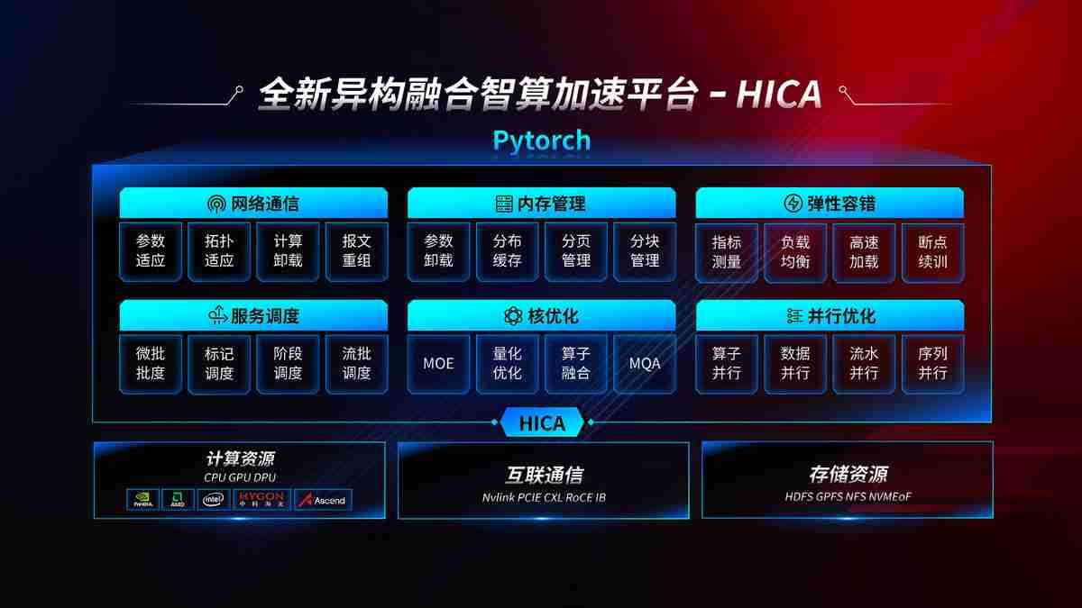 通过自研的服务层、、、、中间适配层、、以及调度编排算法,,,采用数据并行、、、、模型并行等多种并行方式,,,把并行计算任务进行有效的分解,,,使其分别由相应的软件栈和算力资源来承接。。。当GPU资源变化,,,,HICA可以实时动态调度计算子任务并调整模型拓扑和架构,,以充分聚合各种算力资源。。。