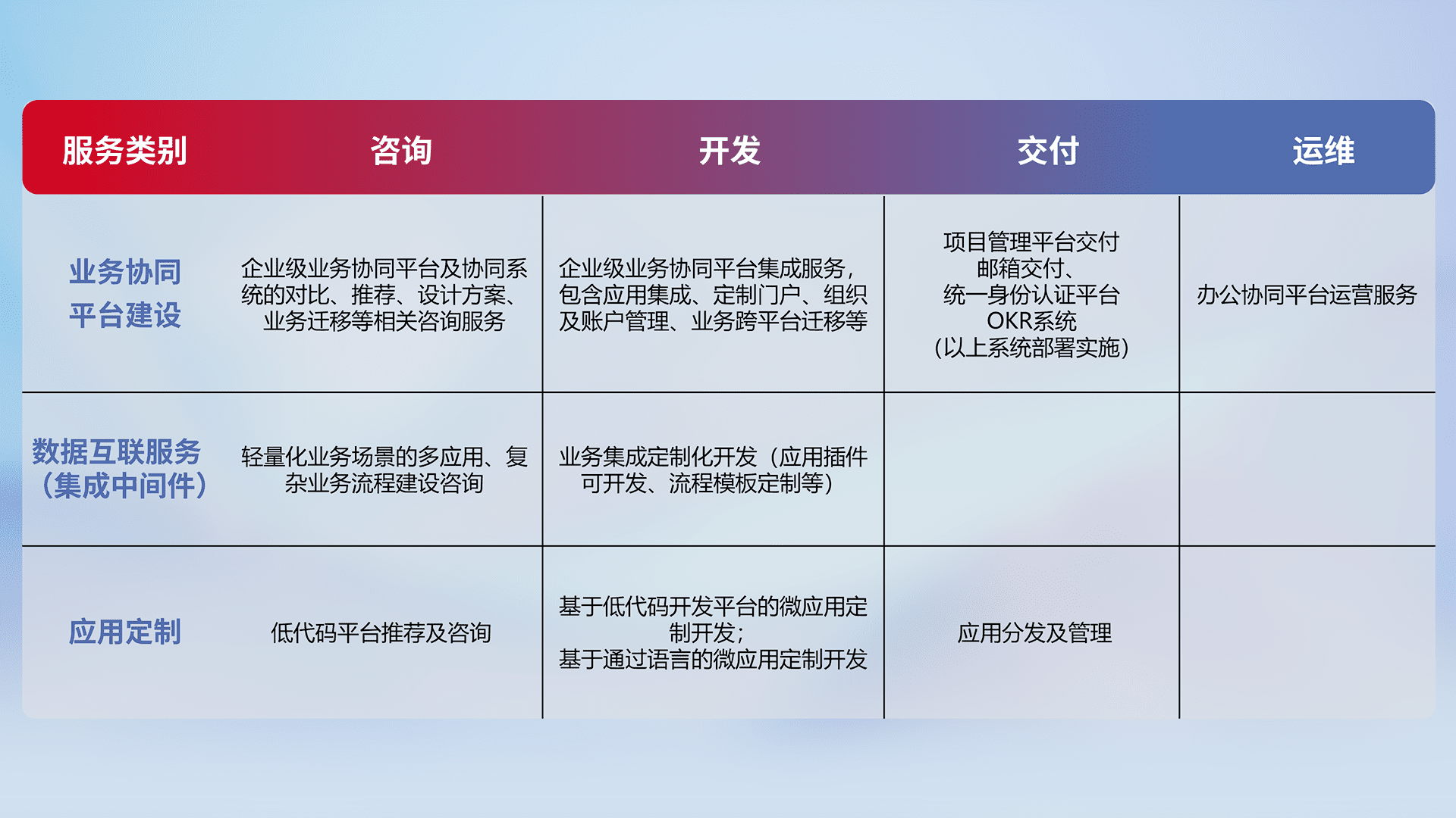 针对钉钉、、企微、、、、IDaas等平台级产品提供产品的规划、、、方案、、、交付、、、定制化开发等服务,,,,实现如统一协同办公、、、、智能客户服务、、、混合会议管理、、智能数据查询、、、等业务场景,,,,实现数字化转型。。。
